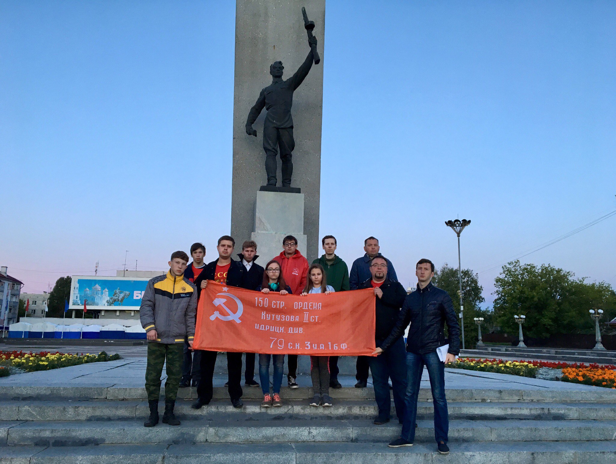 Почтив память жертв фашизма и развернув копию Знамени Победы они прошли к площади Партизан через проспект Ленина, сообщается на страничке Вконтакте