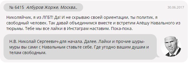 Некто Албуров Жорже (немного измененное имя одного из сторонников Алексея Навального), представившийся активистом ЛГБТ, предложил Валуеву вместе встретить оппозиционера из тюрьмы, где тот тот отбывает 30-дневный арест за события 12 июня.