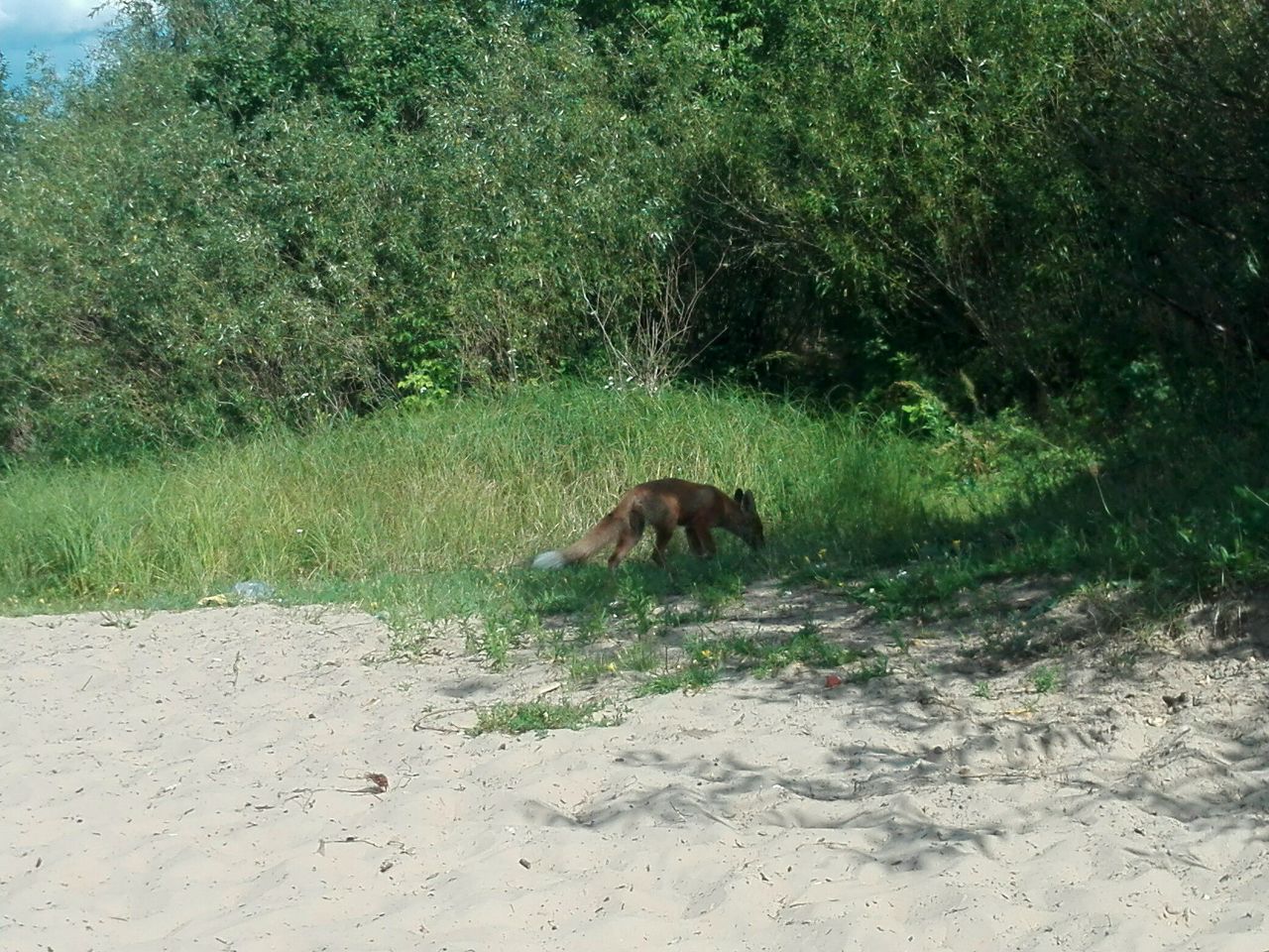Жители Новозыбковского района Брянской области на Перевозе на детском пляже сфотографировали маленького лисенка.
