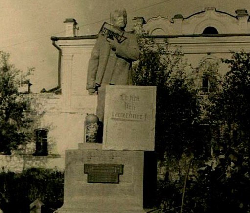На фотографии запечатлен не только первый памятник Владимиру Ильичу в Стародубе, но и результат вандализма захватчиков.