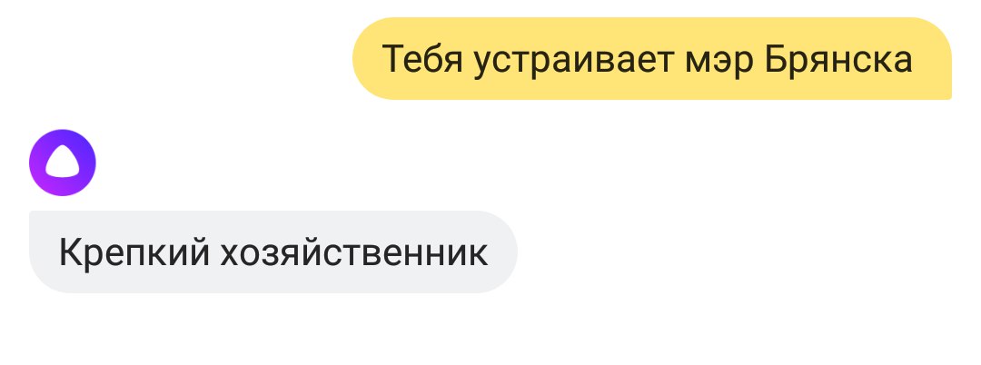 Выяснилось, что нейросеть имеет своё мнение и о брянских чиновниках. На вопрос «Тебя устраивает мэр Брянска?» «Алиса» ответила, что он крепкий хозяйственник.