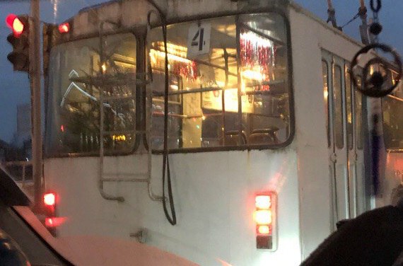 Горожане заметили первый «новогодний» троллейбус с елкой в салоне.