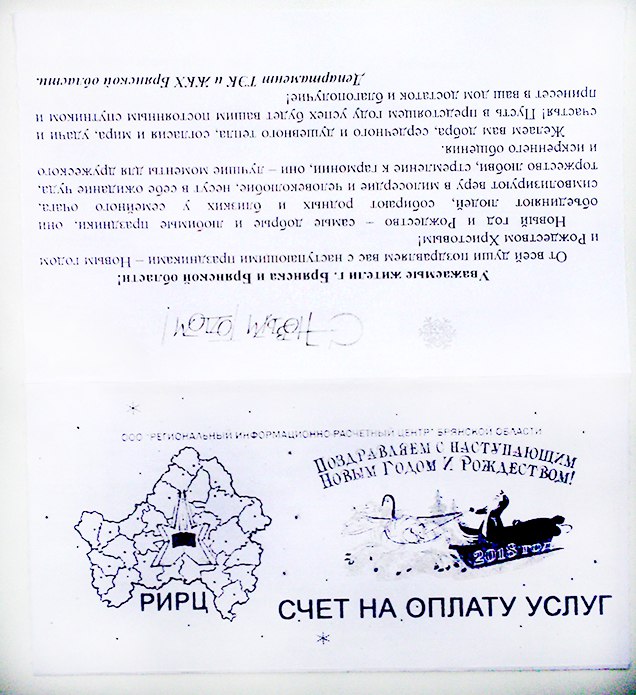 Жители Брянщины на днях получили квитанции на оплату коммунальных счетов за ноябрь 2017 года. ООО «РИРЦ», которое рассылает платежки, а также департамент ТЭК и ЖКХ Брянской области решили поздравить земляков с наступающим Новым годом и Рождеством.