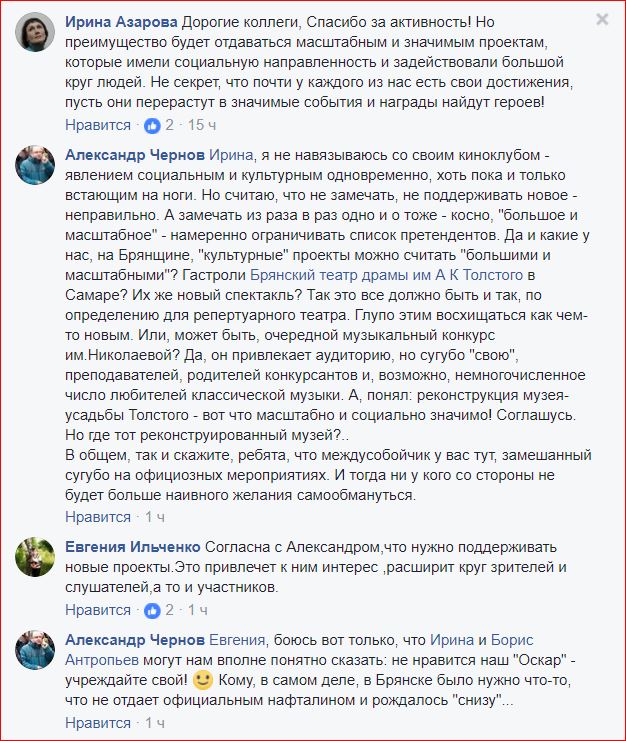 - Чернов в этом году затеял интересный и полезный проект - Брянский клуб актуального кино «Цифра & Пленка». Уже было три показа, удалось побывать на 2-х из них, в Арт-кафе 113. Все три социальной направленности. Дискуссии ведет он и соведущая - его супруга Н.Чернова. Стоит обратить внимание и на этот проект, - написала Елена Федотовская.