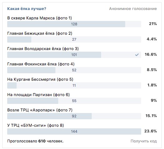 На днях в группе «БрянскToday» социальной сети ВКонтакте прошло голосование за самую красивую новогоднюю ёлку Брянска. Читателям предложили на выбор восемь вариантов.