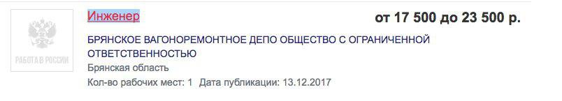 Один из брянских Telegram-блоггеров промониторил ситуацию с зарплатой брянских инженеров и написал отчёт. На сайте Роструда он обнаружил, что некоторые заводы и предприятия предлагают зарплату в 13-15 тысяч рублей. Так, Почта России обещает ведущему инженеру жалование в 13440 рублей.