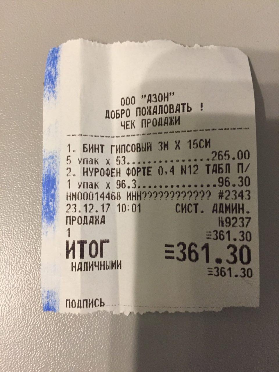 На вопрос, почему мне нельзя прямо сейчас сделать «блокаду» новокаином, мне дали понять, что мое слово для них последнее. Впоследствии выяснилось, что гипсовых бинтов в больнице нет, соответственно делать «блокаду» бессмысленно, так как лангету наложить фактически нечем. Кое-как меня перетащили на том же коврике на кушетку. До утра пролежал в мокрых джинсах, причем прямо с ботинком на поврежденной ноге. Медики отправили супругу в аптеку за гипсовыми бинтами.