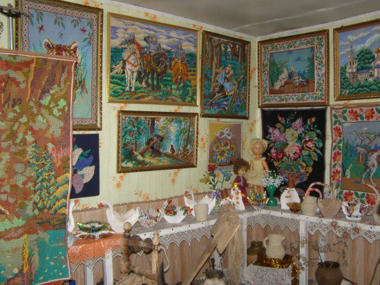 В первом помещении установлена вешалка с вышитыми крестом и гладью одеждами: рубахами и сорочками, сарафанами и фартуками, в другой комнате - вышитые иконы.