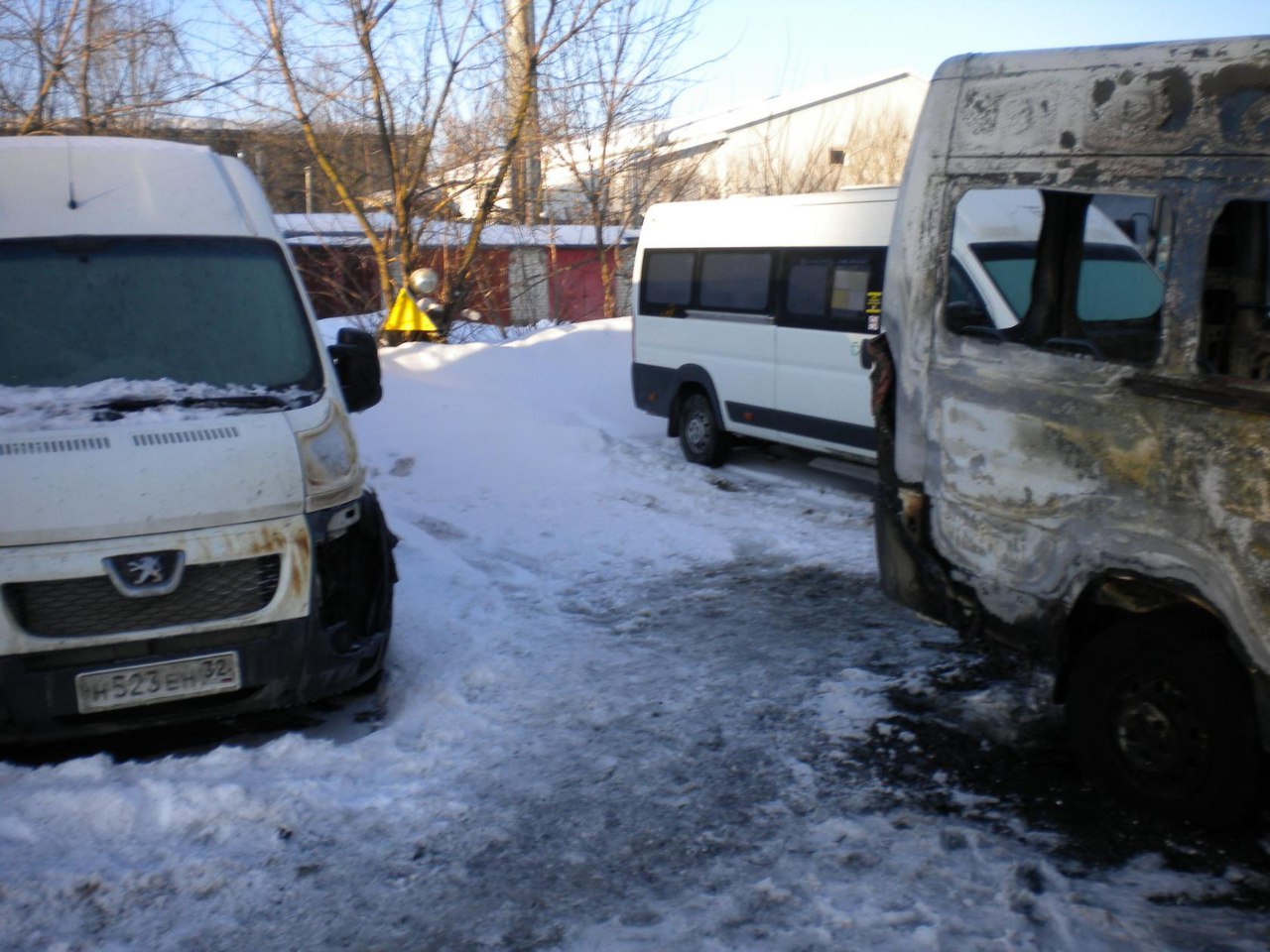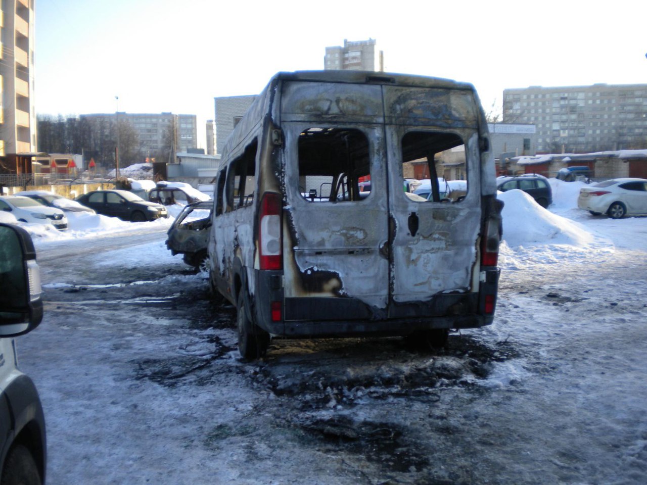 Маршрутка выгорела дотла. Стоянка расположена на пригорке, поэтому в начале пожара микроавтобус по инерции проехал вперед, затормозив у двух легковых автомобилей. Ford сгорел, соседней иномарке тоже сильно досталось. Пострадали и другие автомобили.