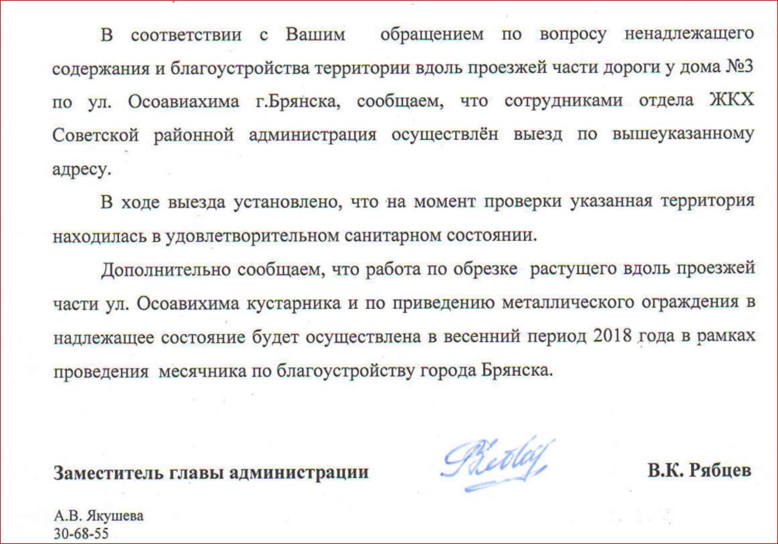 Жители пытались напомнить чиновниками про их обязанности, однако в администрации Советского района Брянска мусор не заметили. Людям пришел ответ за подписью замглавы района Рядцева: