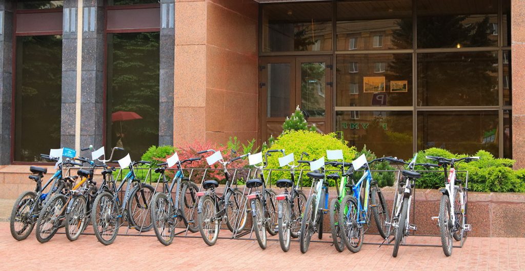 На площади Ленина велосипедистам вручили сувениры за участие в акции. У здания горадминистрации было организовано место для парковки велосипедов.
