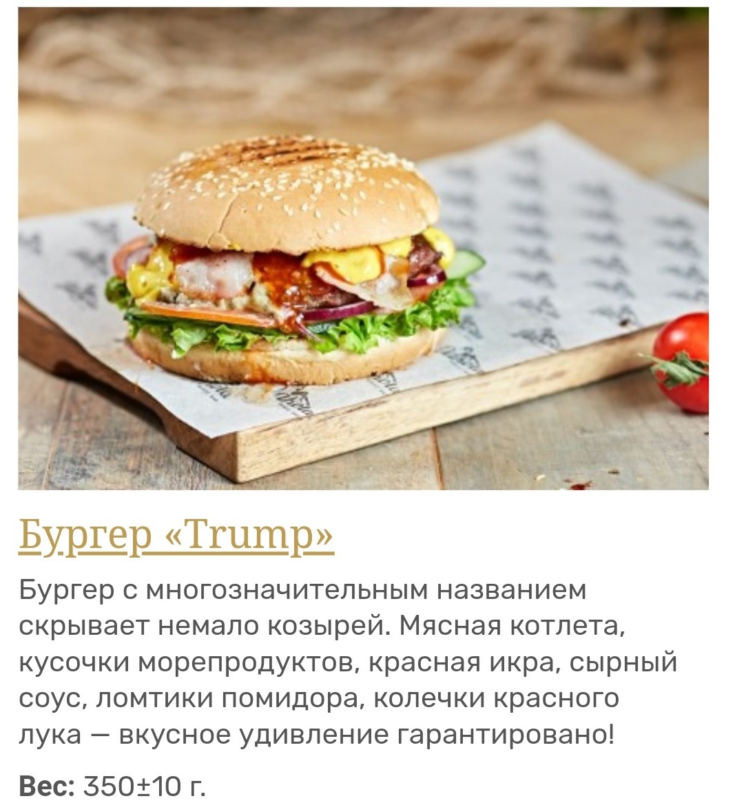 Блюдо с необычным названием появилось в меню одного популярного ресторана в Брянске. Посетителям предлагают отведать бургер под названием «Trump».