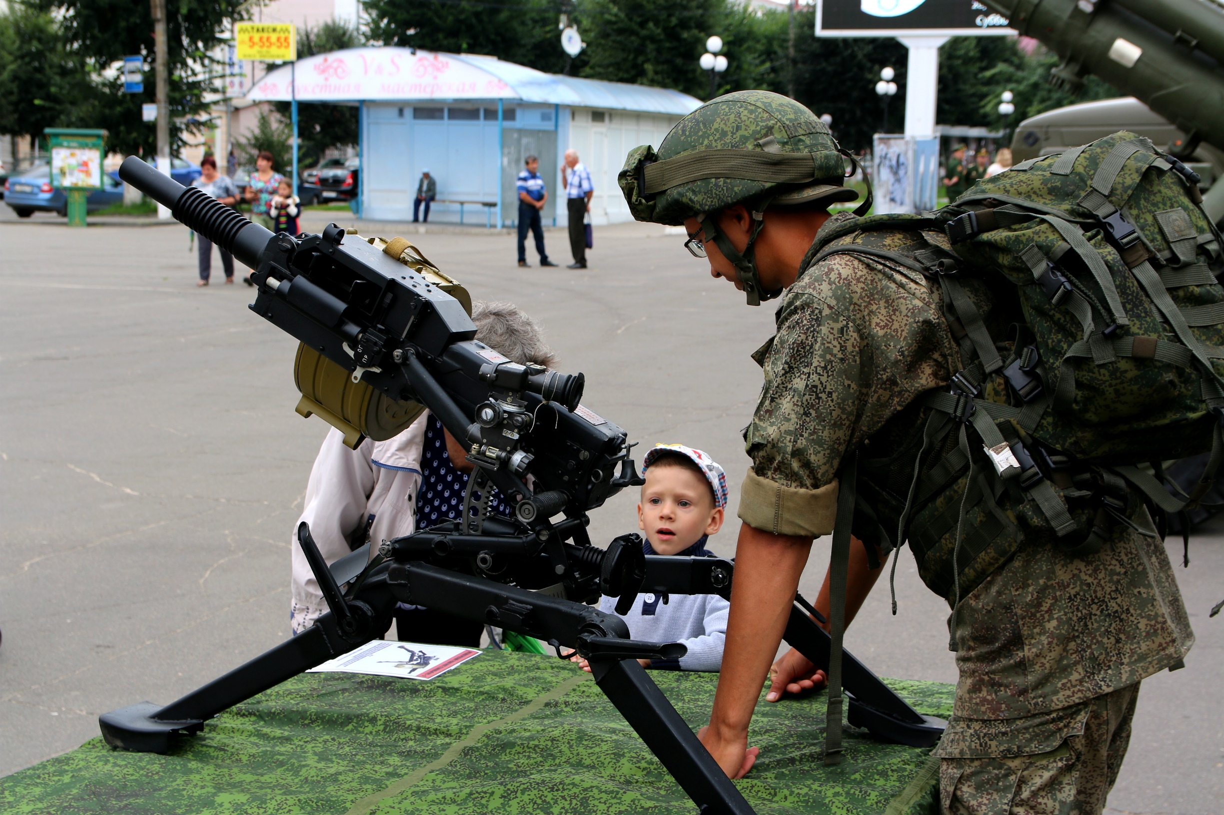 Жители Клинцов с интересом разглядывали современные образцы вооружений Российской Армии. Гостей выставки угощали солдатской кашей и чаем на полевой кухне.