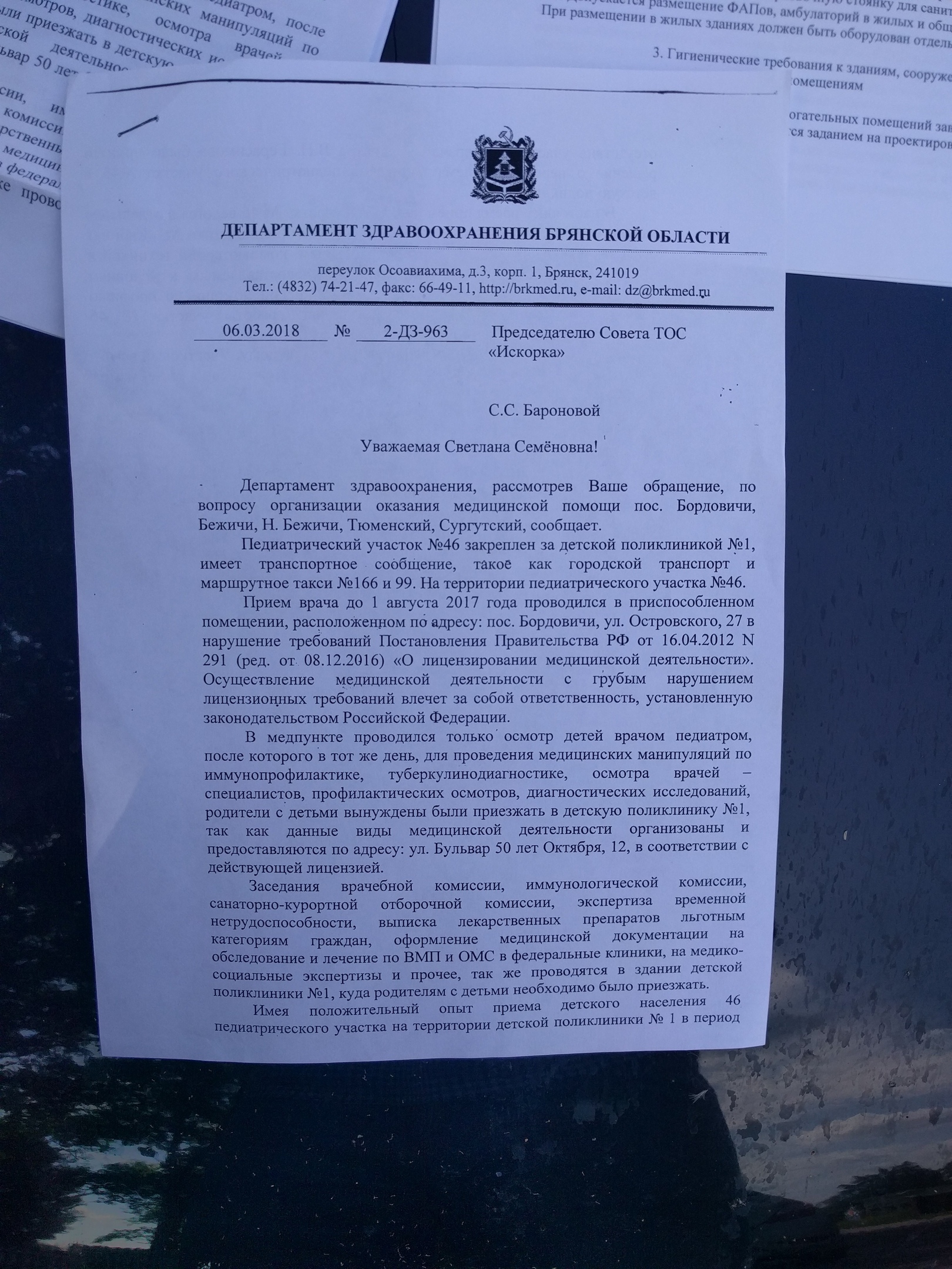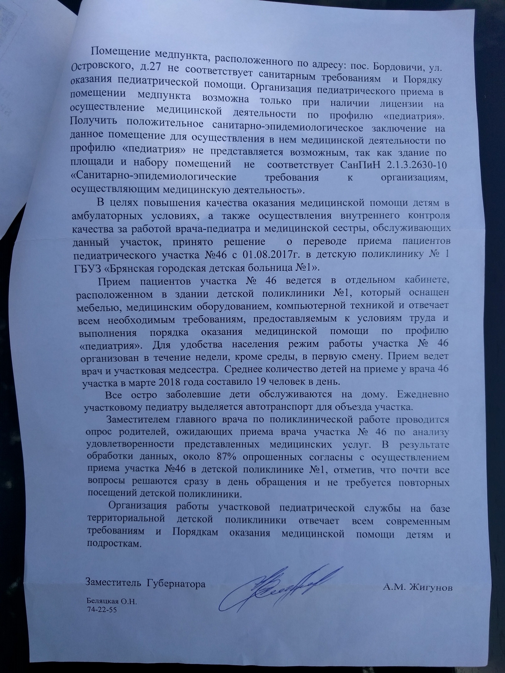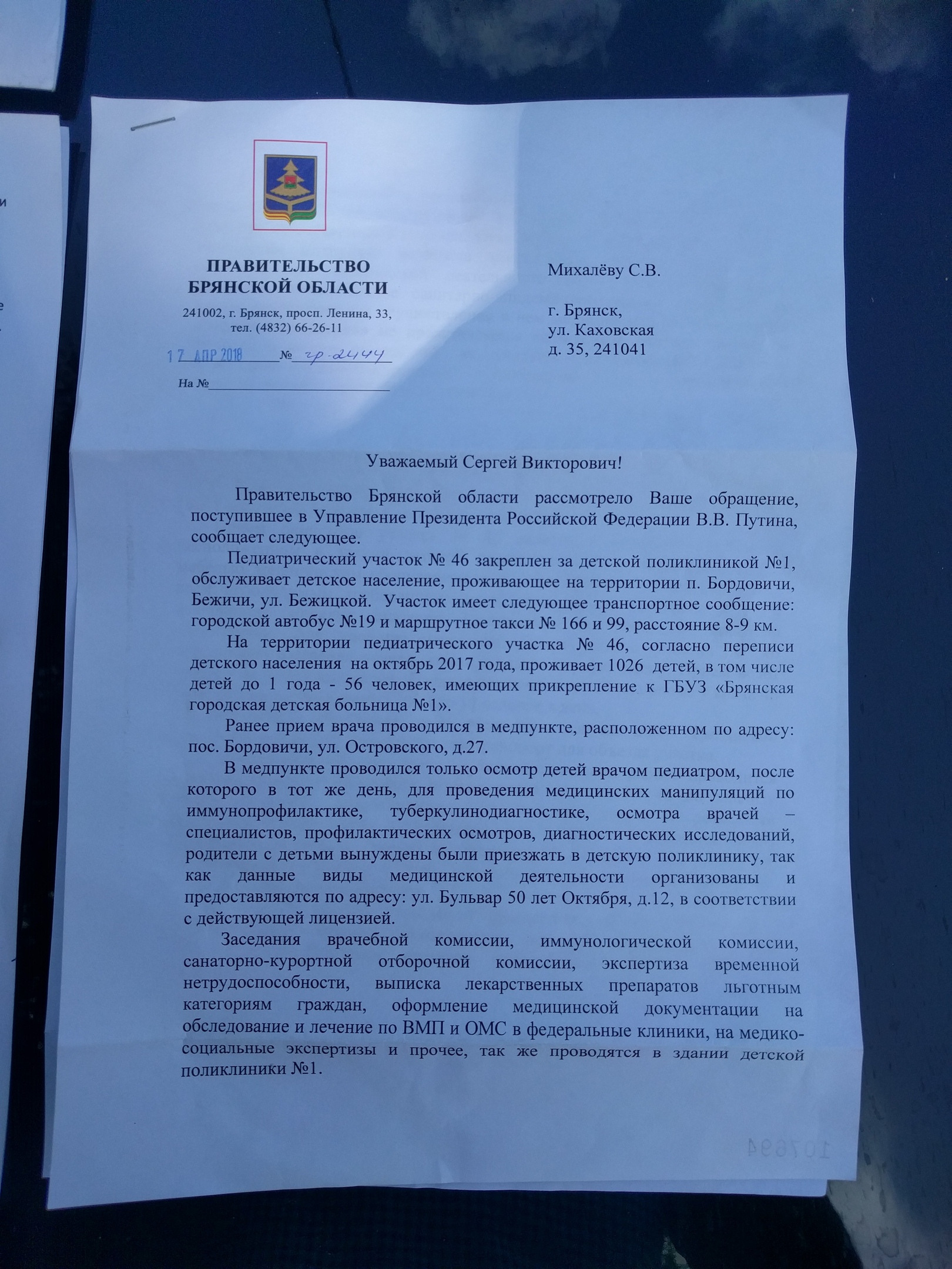Они обращались к сенатору Екатерине Лаховой, брянскому омбудсмену Тулупову, в Бежицкую администрацию, мэрию и даже областное правительство. В ответ от департамента здравоохранения приходят отписки, в которых рекомендуют возить детей в городскую детскую больницу №1. Но такое положение дел местных жителей не устраивает.
