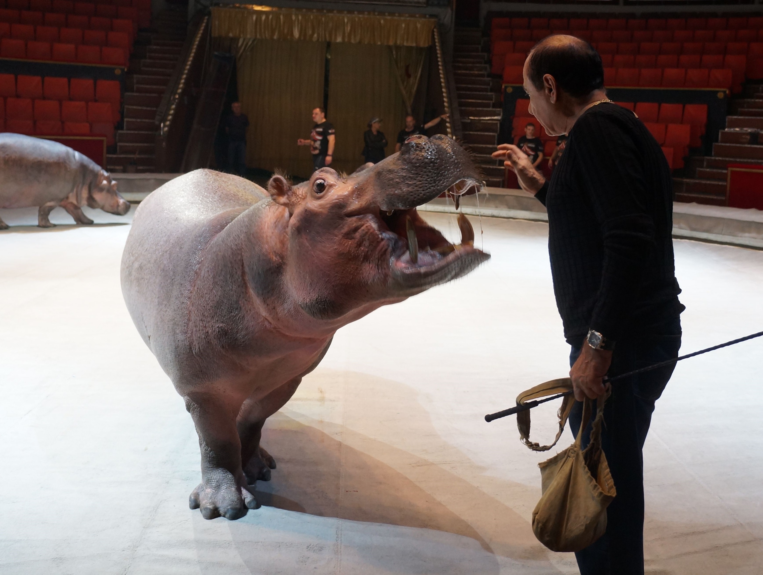 – Прежде я работал с бегемотами и обезьянами по отдельности, но по просьбе Гии Эрадзе соединил их. Это было сложно, потому что обезьяны возрастные и очень боятся бегемотов, но потихоньку удалось приучить работать совместно, – рассказал Тофик Ахундов. Отметим, что бегемоты считаются самыми опасными животными в Африке и сложно поддаются дрессировке. А Тофик первый дрессировщик, который в мировом цирке вывел на манеж целую группу артистов-тяжеловесов. Дрессировщик приручал их работать с детства и добился отличных результатов, но в манеже всегда нужно быть настороже.