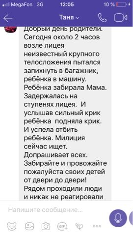 В ней говорится, что неизвестный крупного телосложения возле лицея пытался запихнуть в багажник ребёнка. Якобы школьника удалось отбить у маньяка, которого сейчас ищет полиция. В пресс-службе УМВД нам пояснили, что подобного происшествия в Брянске не было и это всего лишь очередной фейк.
