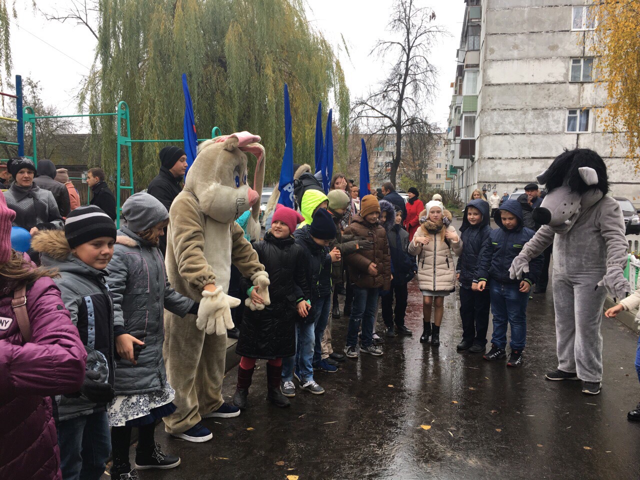 Интересно, что детей развлекал не медведь, который, как известно, является символом «Единой России», а другие представители лесного царства - заяц и волк, который получился на редкость лохматым.