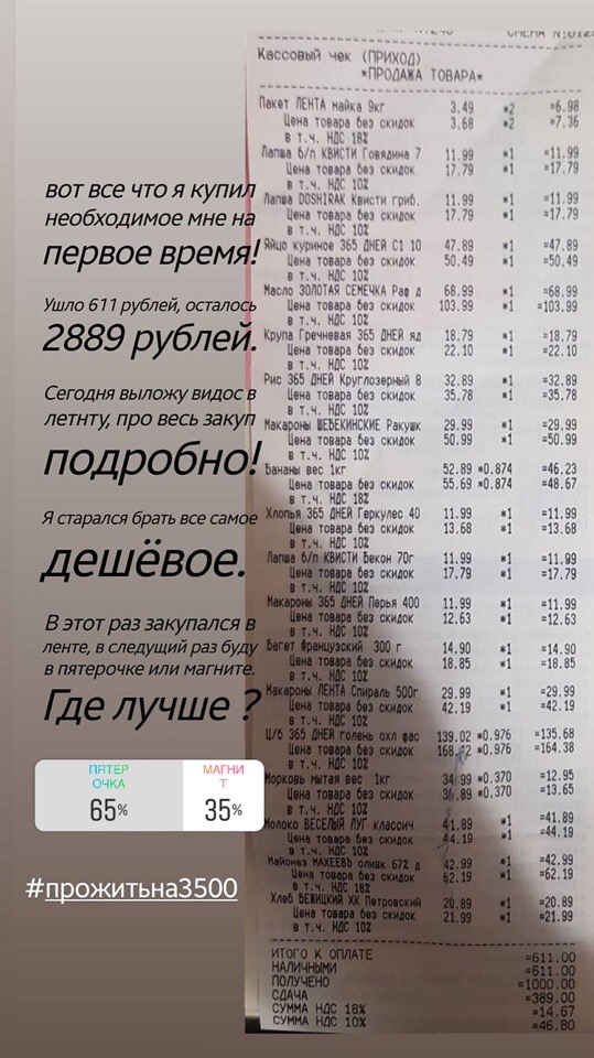 В первый же день он закупился на 611 рублей. Вот список покупок: