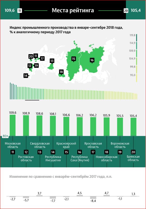 Брянская область вошла в двадцатку динамично развивающихся с индексом промышленного производства в 105,4 процента. мы обогнали Белгородскую область, Санкт-Петербург, Калужскую, Курскую области и даже Краснодарский край.