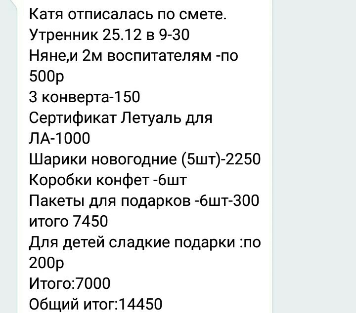 Праздничное мероприятие всего обойдется в 14450 рублей. В группе 37 детей, если, к примеру, на утренник придет 30, то надо будет скидываться примерно по 500 рублей.