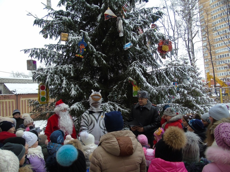 Работами школьников и воспитанников детских садов украсили новогоднюю елку на проспекте Московском возле здания городского ГИБДД.