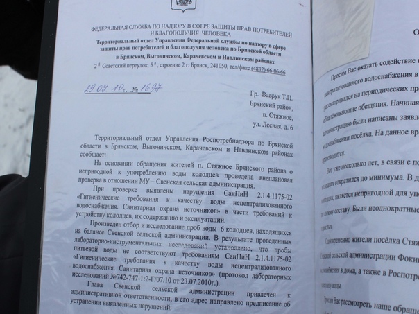 В 2004 году начали свой «поход за водой» жители поселка Стяжное, еще недавно и вовсе административно относившегося к Фокинскому району Брянска. Имеющиеся в Стяжном восемь колодцев снабжают жителей малопригодной для употребления водой, которая имеет горьковатый вкус, желтый оттенок и оставляет после себя слизь на емкостях, в которой хранилась. Стяжновцы утверждают: в поселке были случаи отравления взрослых и детей. К тому же уровень этой мутной воды в колодцах сильно упал в последнее время – летом они практически пересыхают, а водопровода в селе нет.