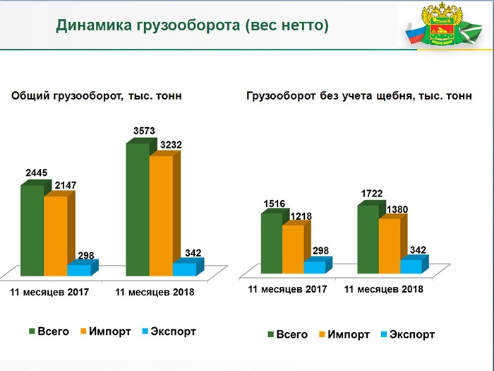 Физический объём грузов составил 3,5 миллиона тонн, объём вывозимых товаров - 341,5 тысяч тонн (больше на 14,6% аналогичного периода 2017 года), ввозимых - 3,2 миллиона тонн (больше на 50 %).