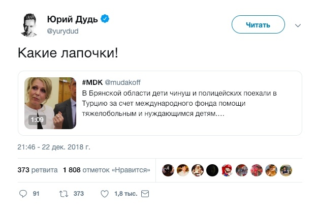Отреагировал на скандал и известный российский журналист и ведущий популярного авторского шоу на Youtube Юрий Дудь. «Какие лапочки!» - написал он на своей странице в соцсети Twitter.