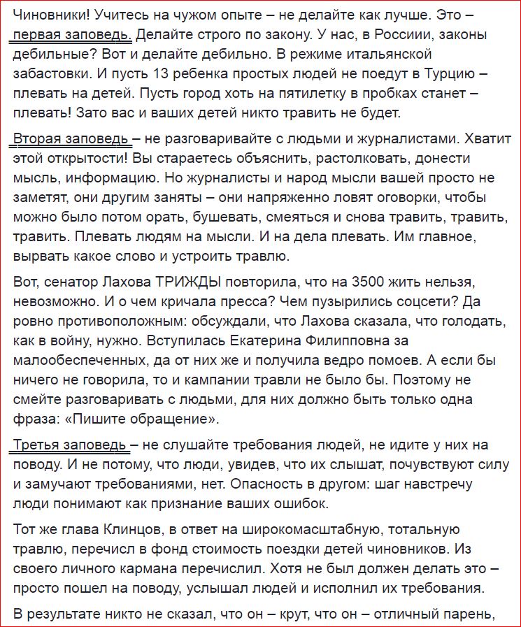 В общем чинуши слишком добры к нам, слишком много для народа делают. А их народ не ценит, пресса не хвалит...В общем хватит пряника, нужно браться за кнут. Или же, если не получилась обмануть, значит нужно перестать вообще как то реагировать, посылать всех "в бизнес", и не обращать внимание на это недовольное быдло. А я бы лучше посоветовал вместо этих "заповедей", кому не нравится уйти в отставку с гордо поднятой головой, показать что у них есть достоинство, что они уважают хотя бы себя, если не уважают всех остальных. Вот пусть сами и идут "в бизнес". Наверняка такие талантливые люди сделают прекрасную карьеру, и дети их тоже. Зачем стараться на благо этого неблагодарного народа. Хватит уже с колен поднимать.
