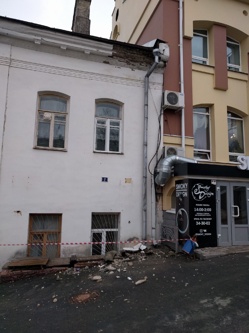 Рухнувший со второго этажа огромный кусок, к счастью, никого не задел. Хотя в вечернее время в этом месте периодически стоят посетители кальянной, а иногда даже припаркованы автомобили. Сейчас возле фасада висит сигнальная лента.