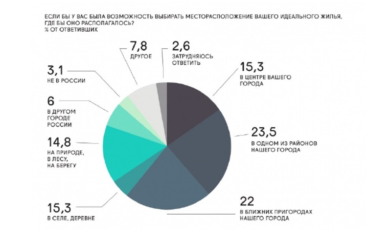А вот по геолокации «жилья мечты» картина получилась весьма интересной. Что бы ни говорили нам маркетологи, россияне не хотят жить в шумных и загазованных центрах городов: желающих набралось лишь 15%.